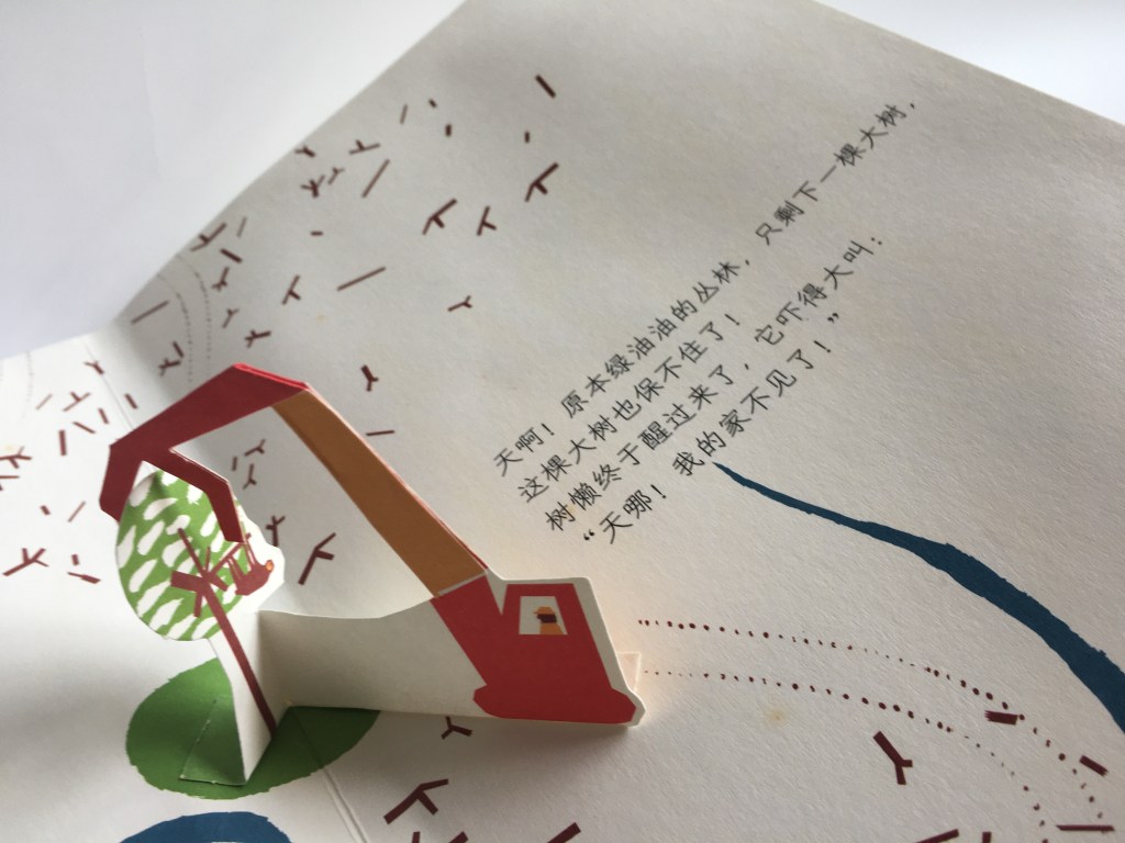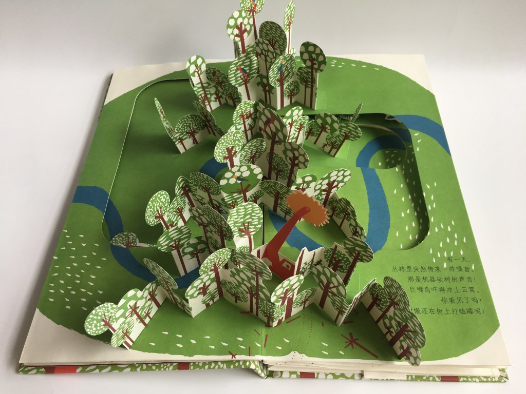 The pop-up book brings you through the process of deforestation and its harm and damage done to the animals.