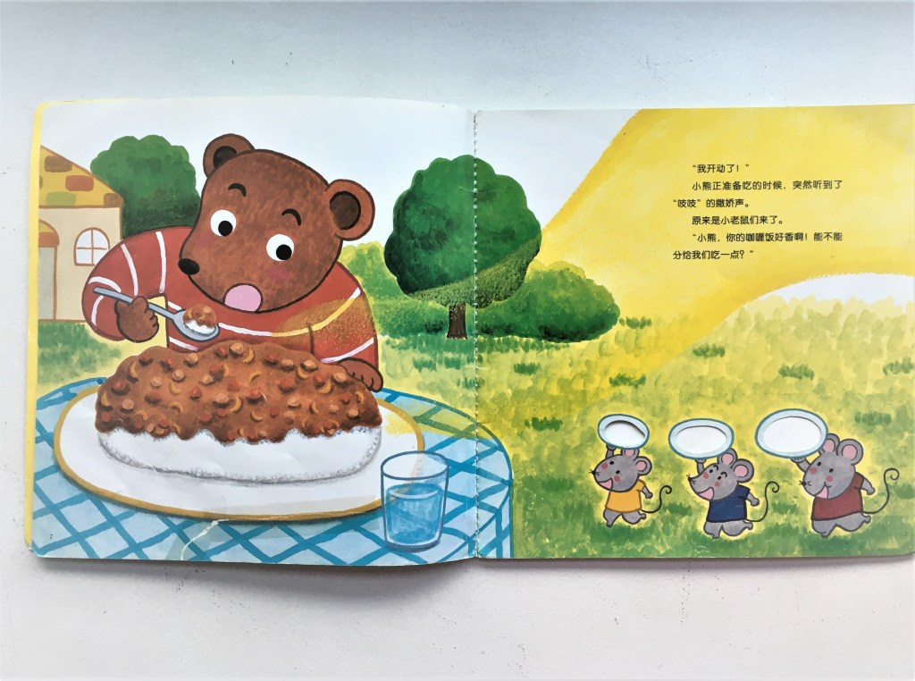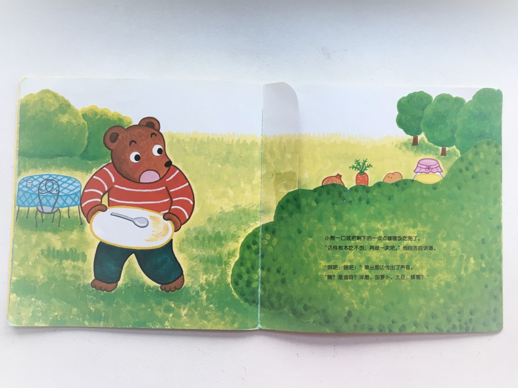 这本书有趣的地方就是能通过洞洞的布置,看到小熊的饭在下一页里变成小动物们碟子上的饭。感觉就好像模拟了小熊把饭分享给了小动物们。不仅我家的小孩爱重复性的翻看这本书,连我都觉得翻时好玩逗趣。